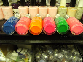 Here are some pic' form the store, my goodness, I love that store, I am always sad when I go in there and there isn't one lonley polish for me to buy, So yesterday I hit the motherload with these, I restrained myself and only bought 10, but I am going back today to take a closer look at the polishes which are named after wines and spirits (' the booze collection .... ha ha) and will most likely pick up a few more, if there is any left. I tried to get pic's from different angels and get their names also, saving me from typing them out. .