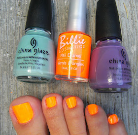 This is Billie 'Orange' with two coats of a richly pigmented white ( also Billie Brand ) and 2 coats of Billie Orange followed by 2 coats of a clear top coat... Billie, - .... (seriously I don't work for them, but, if I did I would have like 3 of each color).... I cannot get over how inexpensive these are and how friggen bright some of them are. I am hoping my favorite discount store in my town will get a shipment of plain white soon, so I can got to town frankening these neon's so I will not have to have 5 layers of polish. However - despite the 5 layers this dried relatively fast. I painted my nails outside today, which turned out to not be so good as there is still ALOT of fine, fine bits of dust floating around.... which ended up sealed forever into my pedi (well till Friday)