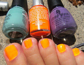The rest of these photos are outside, I find neons photograph best in the shade. I have paired my toes & the bottle with polish everyone seems to have, or that there are 1 million photos of across the interwebs China Glaze 'For Audry' and 'Spontaneous'. I have also kindly colored over my toe fur.... I am not ready to show the world my hairy toes.