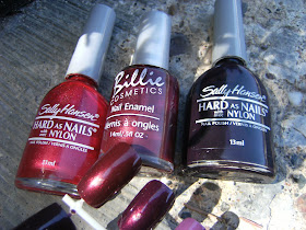 L to R; Sally Hansen 'Radish' (I know, I know ) Sally Hansen 'Root Deep' (I know, I know ), and the lovely Franken I named 'Last Car Payment'.