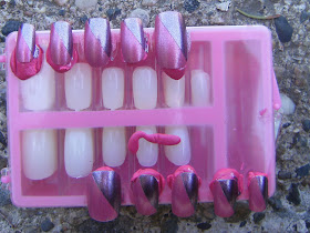So..... I just cut out a simple 'S' curve using the curved end of a nail file...... I used mailing labels because I find the 'glue' does not stick as much a s other types of stickers.....Honestly, this 'S' curve was all experimental, but it worked out amazingly well, Then I gently cut them out..... I did not want the curve to be too ying-yang like, just a gentle curve. I stuck some false nails which I shaped to my natural nail onto a case of acrylic nails with that power tack stuff ( that stuff is awesome!!!) painted 2 coats of Silver, waited for it to dry, then applied the sticker and painted two coats of the pink ~ Viola!!!! Next time I will do more contrasting colors - but I do think this is very pretty. There is no way I would attempt this with the stickers on my finger-nails and trying to polish my fingers, this was way easier for me this way......