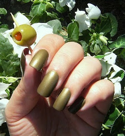ReplyDeleteI adore this shade of olive!It has a flash of gold in it. Just a beautiful polish. This is also my favorite color eye shadow. The olives look delicious. I can't have them around. They are so salty and I'm very salt sensitive. Once I start to eat them I can't stop. They also taste great in a martini!