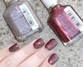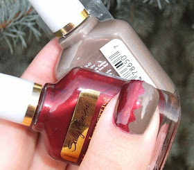 So after spending the day wearing Sally Hansen Cappuccino I wanted to do something a little different. I got my pinking shears and mailing labels out, and cut out a zig-zag pattern. I made sure my nails were clean and free form moisturizer & other stuff and affixed the 'zig-zag' sticker to my nail, I painted two thin coats of Sally Hansen New Lengths in 'Blackberry'. When it was dry~ I removed the 'zig-zag' stickers, gently buffed out any raised areas & applied 2 coats of Sally Hansen Clear Nail polish. This polish 'Blackberry'= is stunning. I didn't really think much of it when I bought & swatched it, but looking at it now... just wow. There is sooooooo much shimmer packed in there! And this sorta dull plain polish 'Cappuccino' is the perfect partner to show off 'Black Berry's' beauty.