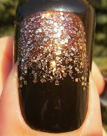 In the post BELOW I have added photos on how I did this. I started with 2 coats of the lovely  pretty-much-looks-black Sally Hansen 'Mocha Madness'. It is only in the strong sunshine that you cans see the brownness and shimmer in this polish. I then sponged on Sally Hansen 'Dark Nut Brown' to the tips of my nails, waited for it to dry, then applied a coat of clear polish and used a toothpick to randomly add these copper square glitters. I swiped on another coat of clear polish, then sprinkled on come small copper glitter, just a smidgen of a shade darker then the copper square glitter.When it was dry to the touch I brushed of any loose pieces of glitter and added a big glob of ChG Fast Forward - waited for that to set then added 2 coats of Nailene Acrylic Strong Top Coat.