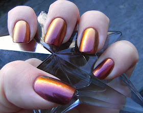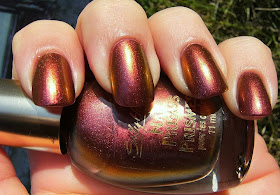 No-one can possibly be sick of nail prisms yet...... Here is the lovely Nail Prisms in 'Bronze Pink' - 2 coats over a pinky-beige base color, and 2 coats of Nailene Acrylic Strong Top Coat. ( I always layer prisms and other duo-chromes ). This polish flashes a rich ruby, a bronze metallic, and a lovely sharp gold. Very Pretty! As all duo-chromes polish's I find that these look their best in the worst lighting conditions..... Hmmmmm. Flash photos did capture the duo-chrome like usual...