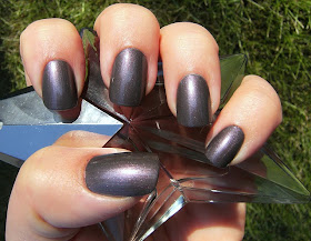 I have had this polish since summertime and barely paid any attention to it. I found it at a thrift store in my town for .50 cents and figured I could franken it up. But - I think this is a truly a lovely polish and is perfect the way it is.  I would say that this color is a "grayed out metallic purple shimmer" =  but besides that I have no idea what to associate this color with.... I have seen a few polish's that are similar in color to this recently but nothing I can compare this to. Afterthoughts is an old, old, old jewelery/girly store that was acquired by Claire's a long time ago.
