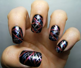 Anyhoo- I started with some forgotten Halloween nails which I never used, I buffed off the bat & moon image and applied a coat of black polish, just to even things out . Then used those dental floss pick things to make these lines.....Whoever I copied this look from did a much better job then I did but I really, really wanted to try and re-create it, because it looked soooo cool!