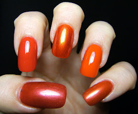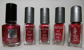 I found these cute mini polish at The Dollar Tree in Grand Forks USA in summer... they are very nice colors - but the polish is very, very strong smelling. One of the has some weird coagulation at the bottom of the bottle which did not transfer onto the nail. The polish on my middle nail stained my false nail badly.