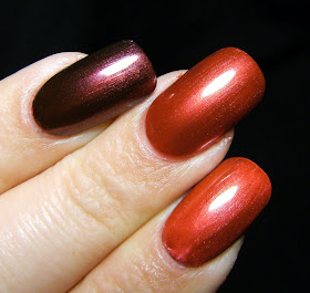I love these types of reds, ones that are just sheer enough that when layered they create a beautiful deep red. I had recently seen this on Strych's blog 'Pretty in Dayton' and had to copy immediately. I usually wear my red's like this anyways, but thought it would be fun to do a comparison/ tutorial.