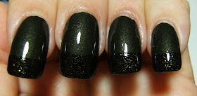Almost immediately after I took photos of my latest franken polish 'Curtain's' I totally trashed it - By opening my curtains..... I somehow rubbed the surface of my nail against the curtains and marred my nails..... so I whipped out my french tip guides, the regular Nailene curved ones, and did a funky french using Icing glitter in a black jelly base. Instead of using the green glitter, I opted for the yellow that came in the 5 pack limited edition set. I applied 2 thin coats of the yellow-ish glitter, and when it was dry, I removed the french tip guides, and applied 2 coats of Nailene Acrylic Strong Top Coat.