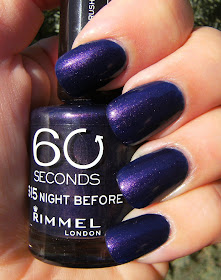 Wow - this is a really cool polish. It is vampy and dark but still looks purple in dim lighting.This is an easily accessible polish that is very similar to Claire's Magic however the base colour is a little darker and seems alot more shimmery to me. Rimmel can be found at department stores and pharmacies and I am pretty sure it will be available for a long time.