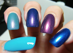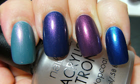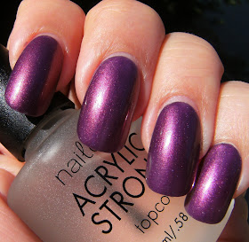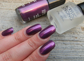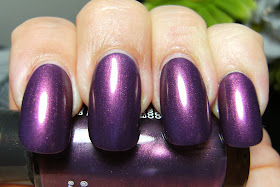 What a lovely colour. I love this pretty purple shade with prominent blue iridescent shimmer that can be seen in most lighting conditions. It's supposed to be 'Insta-Dri' but I found it took a long timer to dry. This also needs at least 4 coats to hide any bald spots = it is very sheer. I think this will be great as a layering polish, but I am a little disappointed that it this sheer.