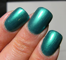 The photos above and the next two are 2 coats of Rimmel Green With Envy, followed by a coat of Nailene Top Coat. I wore this polish twice this week, I had some weird application issues that I found strange. This is a very pretty colour that IS NOT GREEN, this is more of a teal shade. The shimmer in this is prominent and it looks beautiful and 'glowey' in all types of lighting.