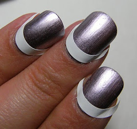 Here is an easy and cute way to stretch a mani - I always end up doing some diagonal design, and this time I wanted to use patterned scissors. I also experimented with blue tape, I had to apply it to a the backing from a mailing label to cut it. The scissors I used were not that great and it was difficult to cut through both materials. Both the blue tape and the mailing labels had the same result. There was very little gooey residue and very little seepage.