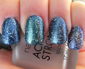 I have applied 2 coats of each glitter franken over 2 coats of N.Y.C. Skin Tight Denim. When i was certain it was dry ( or close to it ) i applied a rediculously thick coat of Nailene Acrylic Strong Top Coat.