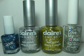 Below - L to R - Mucho Glitter, Claire's Chunky Silver, Claire's Chunky Gold, Love my Nails Crystal