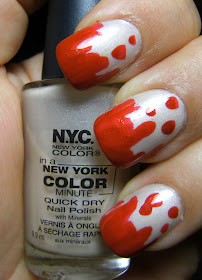 ewwwwwwwwwe! I just saw a beautiful Halloween mani using a lovely pale shade as the base, and had bright blood red splatter-ey tips. It was really cool so I had to copy this for my Halloween manicure for the night! I used NYC Mulberry Street, and A NEW TO ME Billie polish called Ruby #08-2. ( - thats gotta be my next mani, it is a beautiful shimmery bright red -)