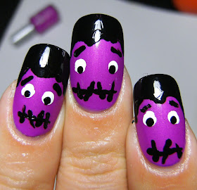 This, by far, is my favirote Halloween nail art this year, I have already done this look with a green base HERE, but I had to do it with this beautiful fluorescent purple as the base. I tried to create girl-ish lips; for a lady Frankenstein' but it did not work out.