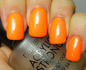 My mani for the day is 3 thin coats of an orange creme with subtle shimmer form Icing ( Claire's ). This is a bright flourescent polish that still had some bare spots after 3 coats. Most of my orange and yellow polish's have bare spots after 3 or even 4 coats.