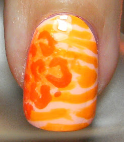 I started with a base of an orange sherbert franken, then used a striping brush to make the zebra stripes with Wet n Wild Sunny Side up leaving a triangular area where I sponged Nicole Fresh Squeezed, then used a small brush to make the cheetah spots with Mavala Nice in the triangular area......
