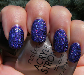 This glitter sprinkle mani is over Wet n Wild Eggplant frost except my thumbs. I applied a very thick coat of Nailene Top Coat, lightly sprinkled on the purple holographic glitter and waited 5 minutes then gently pressed down on  the glitter to have all the glitter pieces laying flat, then added another coat of TC, and another coat when that was dry.