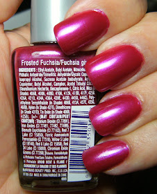 below is Wet n Wild Frosted Fuchsia - which is not a frost at all! It is a very bright shimmery polish that took 3 thin coats to get to opacity. This is another polish that I picked up a few times and put doen at least 4 times over the years.