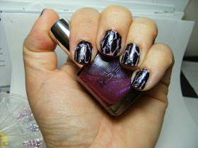 This is supposed to be one of those cool splatter manicures..... I have tried this twice and cant seem to get it right.  The base is 3 thin coats of Wet n Wild White, with Wet n Wild Eggplant Frost and Wet n Wild Frosted Fuschia. Maybe the polish I choose dries to fast or is not viscous or runny enough to get the splattered look...... HERE is a great tutororial over at The Polishaholic.