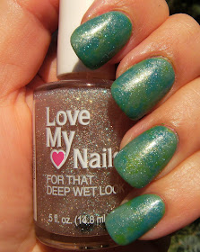Todays mani is 3 thin coats of Sinful Colors Savage with 2 coats of Love my nails Dazzling. Sinful Colors Savage dried very fast, it required only 2 coats but I did three anyway. Also; it dries matte which was a surprise. It is a beautiful lighter teal shade that leans towards the blue side. Love my nails Dazzling is a multi-coloured micro glitter that dries gritty - but smoothed out with a coat of TC.