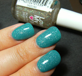 My photos do no showcase the pretty blue and green micro-glitter in Dazzling; but they are very apparent in the bottle. This will definitly be used next time I do 'space nails' becuase the glitter reminds me of stars......