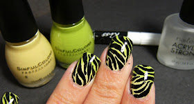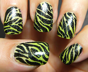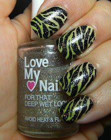 Except for the fine cracks in the black Kiss nail art pen, this turned out pretty awesome. I used Sinful Colors Unicorn and Sinful Colors Innocent, sponged on and graduated, then drew the zebra stripes with the fine tipped Kiss nail art pen. When I added TC, the Kiss nail art pen displayed fine cracks..... I wasn't expecting that. So I did what I always do when things don't turn out as expected...... I added Love My Nails Dazzling = Is there anything it can't fix?