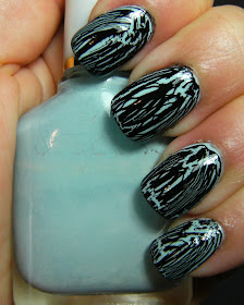 Today I was lazy, so I slapped on a lovely blue franken I made with Wet n Wild Caribbean Frost and a bright white creme. I added 1 coat of Ardene Black Crackle and a coat of TC. I like how this is a stringy crackle...... and not a chunky crackle. I am really not a fan of the whole crackle look.
