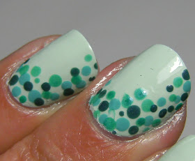 The base of this dotty manicure is a lovely mint franken, and the dots are also frankens.... I used a dotting tool to make the dots. The polish I used are Frankens i made over 2 years ago........Here is the original post
