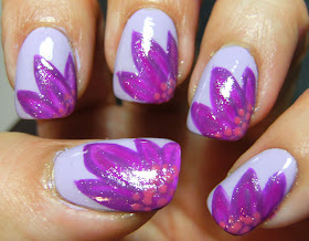 It was sooooo gloomy outside today - so my mani needed to be bright, cheerful nail art. I started with 2 coats of Sally Hansen Lacey Lilac. Using a pretty magenta stripe polish I drew and filled in the base of the flower, then outlined it with a darker magenta stripe polish. I used a bright pink stripe polish to make dots for the flower center. I added Sally Hansen PinaColada Pop over the flower, then added a coat of TC.