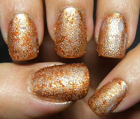 I had to scrape off those little balls after 3 1/2 hours..... and this is what my nails looked like after.....neat huh? I used a scrape-ey manicure tool to scrape them off then used the nail polish remover I always use. I only spotted a few of those pretty copper microbeads around the house ( for those that were asking ) They hung on for a surprisingly long time considering I just applied top coat then poured the microbeads on my nails......