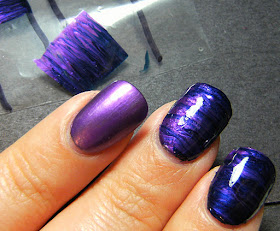 I used 2 of the same frankens from my dotty manicure above. I started with 2 coats of the lighter colour, then dipped some scruunched up saran wrap into a few drops of the darker franken. I was surprised that the blurple shimmer showed up on my nails .....