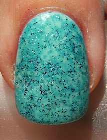 I had different plans for today's manicure..... I tried to do one of those circle mani's, using a pen dipped in polish but I goofed it so bad I went to my dependable stand-by nail art = a sponge manicure. This is 2 coats of China Glaze Foe Audrey, then a sponging of Essence Choose Me, then a sponging of Pure Ice Strapless ( sapphire blue glitter ) and a coat of TC.