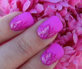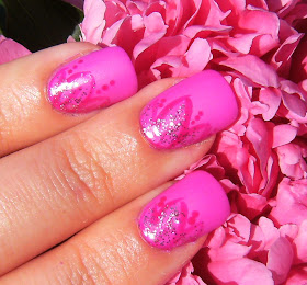 This was 2 coats of Billlie Cosmetics Purple Rain, followed by a coat pf the newish NYC matte Top coat. I used LA Colors Nail stripe polish in Wild Fuschia, added some LAColors Glitter and Wet n Wild Sparked Glitter ( from fantasy makers line from last Halloween) .