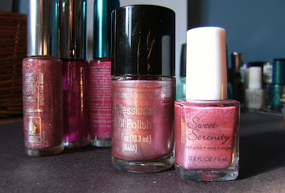 When I first started buying these Sweet Serenity polishes from the Dollar Rama - they had the consistency of lumpy Elmer's school glue, never dried and had a weird smell. however I have since purchased 4 new sets and am very happy with the quality. This is a lovely metallic pink that was good in 3 coats, application and dry time were fine. these come ion sets of 3 for $1.25 CAD and Dollar Rama has new shades every so often.
