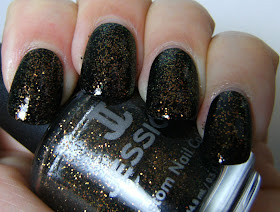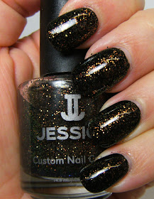 Jessica Glitterati  is a dense iridescent glitter, it is mainly copper/gold/red, with a strong green/yellow colour shift ( yes, i copied most of that from here). What i liked most about this polish is that at two coats, the glitter disbursement was perfect, meaning I didn't have to fill in any areas that didn't have enough glitter. I will definitely need 2 to 3 coats of Top Coat with this..... It was a bumpy finish after 1 thick coat of TC. I layered this over 1 perfect coat of Wet n Wild Black Creme.