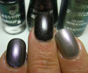 For comparison, below is 2 coats each of  Essence Where's the Part, Chic Reloaded and Wet n Wild Greys Anatomy. Wet n Wild Greys Anatomy is an extremely sheer polish and looks better layered over something.