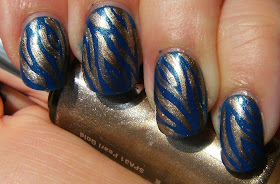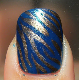 I am calling this Fanny Z # 83 polish 'Whoa' because it is a beautiful shimmery blue that made me say 'whoa'! This is 2 coats, and some gold zebra stripes with a franken stripe polish I made ( it's really just Claire's 24 Karat in a stripe bottle ) I chose not to use the obvious silver colour of stripe polish and instead went for a metallic gold. I think this turned out lovely. I am still working on the thickness of my stripes.......