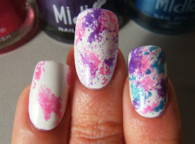 Sponge Mani's will always be my go to nail art - - it is so easy to do and almost always looks good. For this Mani I started with a coat of Wet n Wild French White Creme, waited for it to dry then sponged on hot pink, light blue and purple metallic nail polish from Midie.... The hardest part about sponge nail art is not getting polish on your cuticles - - - it really is fool proof!
