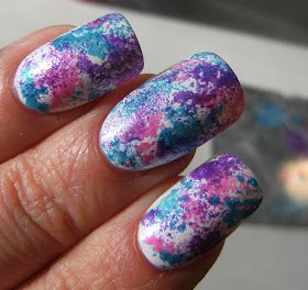 Sponge Mani's will always be my go to nail art - - it is so easy to do and almost always looks good. For this Mani I started with a coat of Wet n Wild French White Creme, waited for it to dry then sponged on hot pink, light blue and purple metallic nail polish from Midie.... The hardest part about sponge nail art is not getting polish on your cuticles - - - it really is fool proof!
