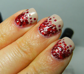 wow ---that Witchcraft red glitter is something else..... it really glows! This mani is a base of Icing Sandy Beach, multi-sized dots made with Kozmic Colours reds, Sally Hansen Red Comet, and Witchcraft Red Glitter. I used a matte Top Coat from N.Y.C. The bland base polish really made this dotti-cure extra special.