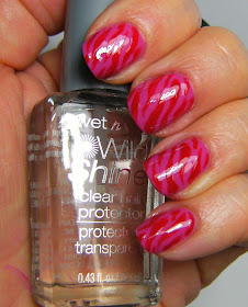 Which brings me to today's post. This is 2 pretty polish's from the Kosmic Colors line that I picked up last summer.... ( summer of 2013)  I used 3 coats of the No-Name Pink, and used a small liner brush to make the Zebra Stripes in this No-Name Red. I added a sloppy coat of the Wet n Wild ' Clear Nail Protector that I found at The Dollar-Rama......
