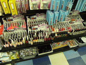 Last night I had the most lovely dream, that I walked into a discount store somewhere, in a far off land, and found bins and boxes full of mini nail polish bottles of all shapes and styles, with the most god-awful colors in them ( so I would not feel guilty pouring them away) But.... this is even better, I am absolutely delighted that my favorite .99 cent store got a shipment of inexpensive - but really good nail polish After picking up ten, the ladies who work there were kind enough to let me take pictures of their newest stock.