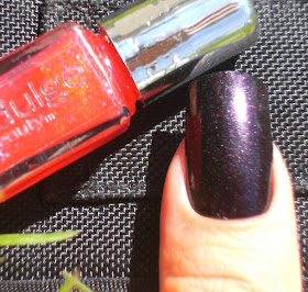 These three mini nail polish's are from the Indulge Beauty 310-09 Tropical Triffle, That I picked up at walmart Canada for $2.57. They are all two coats over a cheap black base. Most of these polish have a really cool flak-i-ness to them..... I am not sure if 'Flakie" is the right word, and it definitely is not glitter.... What would be a proper description for these"pieces-of-something" in the polish....... hmmmmm. None of these polish's have names, they just have the name of the little trio they belong to.