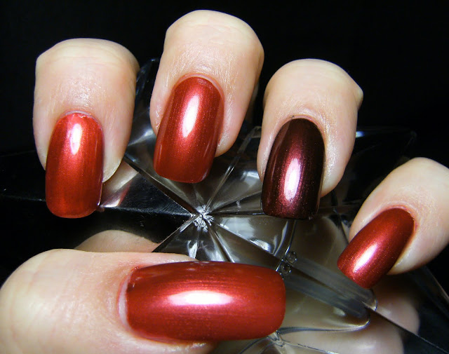 I love these types of reds, ones that are just sheer enough that when layered they create a beautiful deep red. I had recently seen this on Strych's blog 'Pretty in Dayton' and had to copy immediately. I usually wear my red's like this anyways, but thought it would be fun to do a comparison/ tutorial.