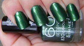 Nothing new and exciting for you; Sorry!.......just trying to get through my many, many, many untried's so I can justify buying more polish! This is a Rimmel shade thats been on the shelves for a while - I guess it's a good seller and so when they changed their polish product packaging this colour stayed in the collection.This is a very pretty green with ( subtle) gold/yellow shimmer.