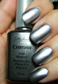 All these chrome polish's I have recently acquired dry very fast with 2 coats; 1 thick coat can work, but I find that I leave alot of brush marks trying to get it right with 1 thick coat. I am so enamored ( or should I say.... enameled....) by this square bottle ~ and I am extra happy that it is a cool colour too! Has anyone else seen Sally Hansen Chromes in square bottles like this before? or even any other lines of Sally Hansen polish in square bottles.